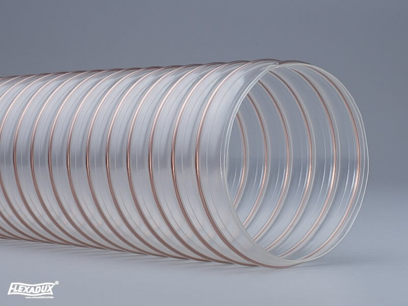 Tubo in poliuretano a base estere rinforzato con spirale in acciaio ramato.